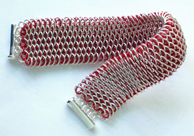 I've been a busy little beading and mailling bee, finishing up myriad UFOs and plotting new twists on old designs. I finished (after running out of the Sterling Silver jump rings and reordering) my first Dragonscale chain maille bracelet in Sterling Silver and Enameled Copper (EC) in Red with a Sterling Silver tube clasp. It is a pain-staking weave, slow and intricate. However, the resulting piece is lavish and drapes beautifully! I'm working up another using EC in Red and Amber on a double bias. Yes, I like to torture myself :P